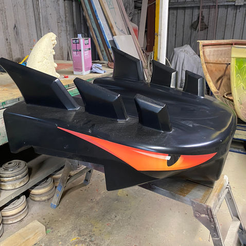 AIRWIRX PROVIDED THE PAINT AND FIBREGLASS WORK REQUIRED TO TURN THIS SUNKID ROLLER COATER TRAIN FROM THE ORIGNAL DRAGON THEME INTO A SHARK BASED TRAIN.